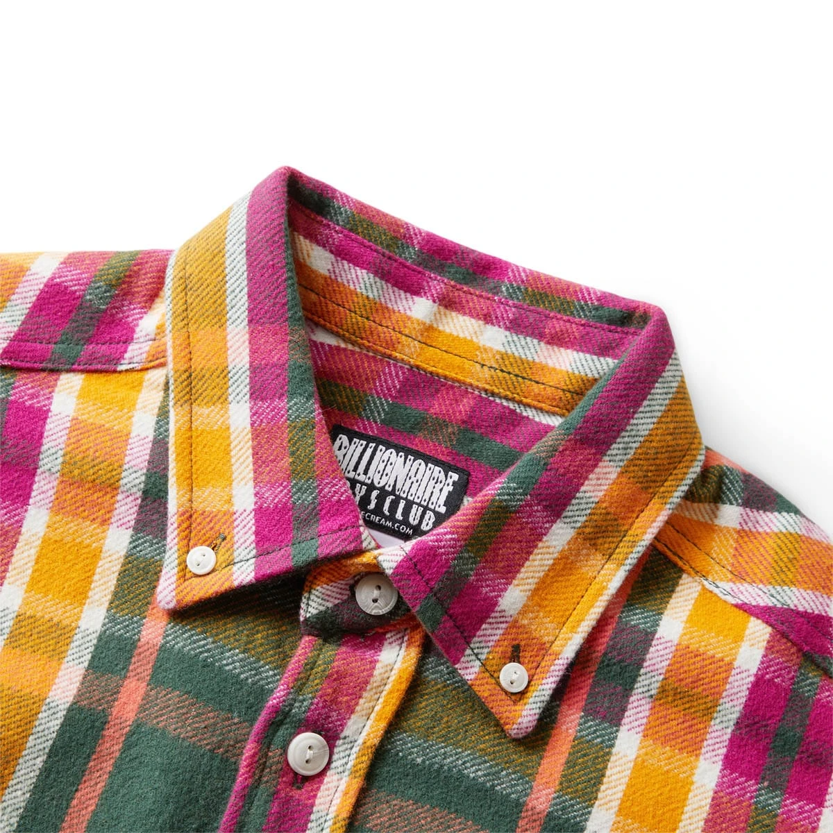 - Button down flannel with print at sleeves, woven label at left chest pocket