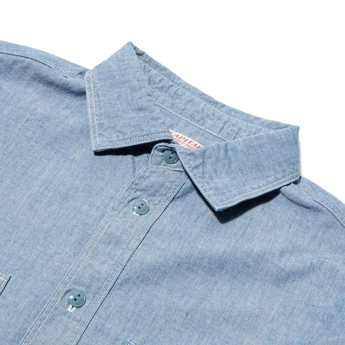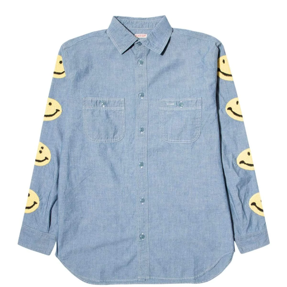 A refreshing chambray work shirt with a smile embroidered on the sleeve. A design with smiles lined up on the sleeve in the hippie embroidery atmosphere found in vintage western shirts and work shirts.