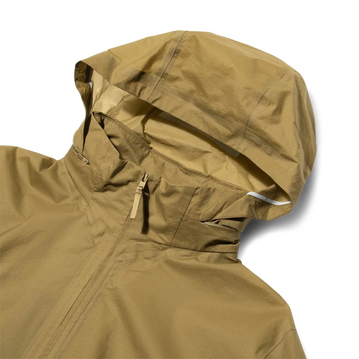 An ultra lightweight nylon coat offers highly breathable water resistance, creating an ideal layering piece for warmer environments. The zippered hand pocket doubles as a stow pouch, increasing functionality for travel and daily storage. A packable hood provides additional weather protection.