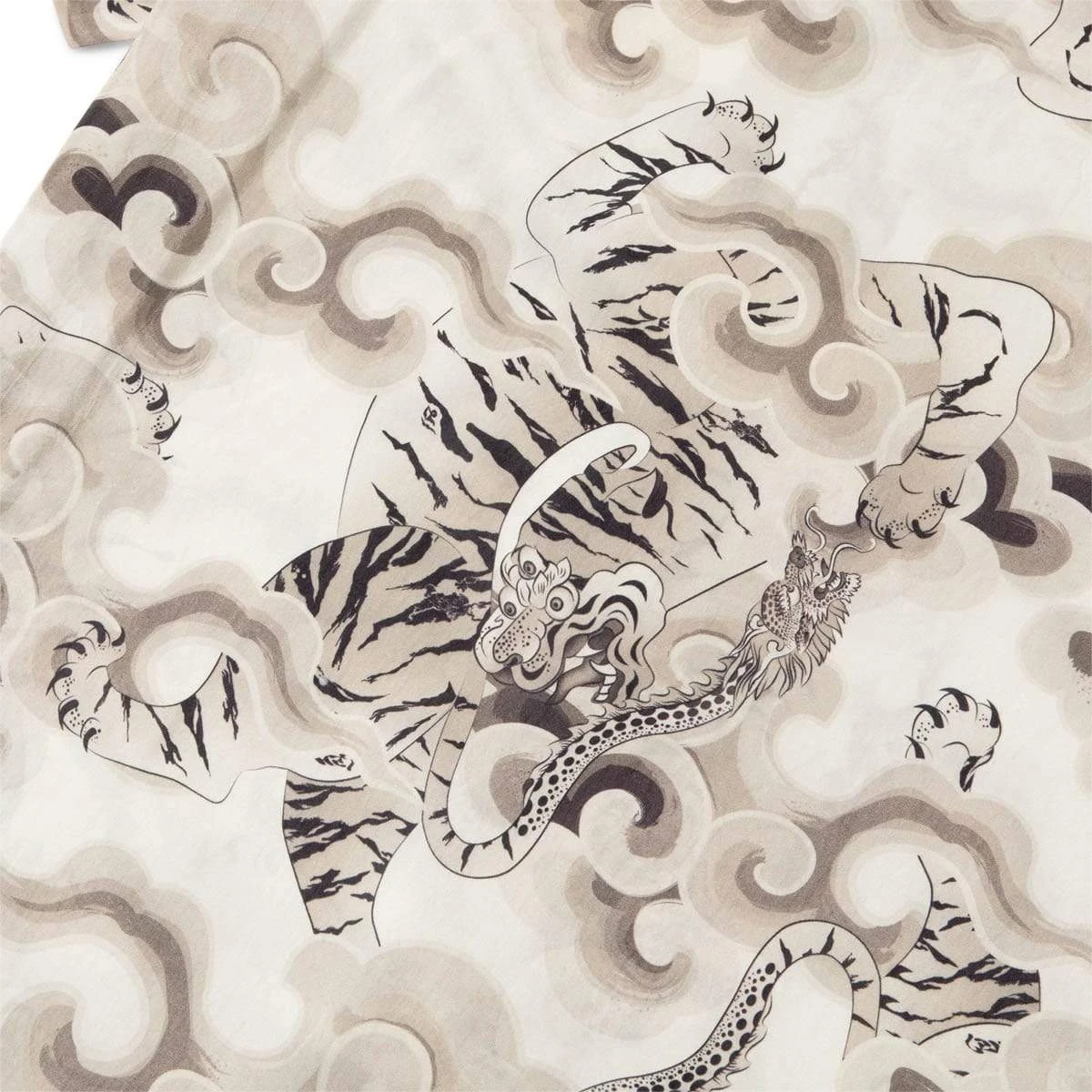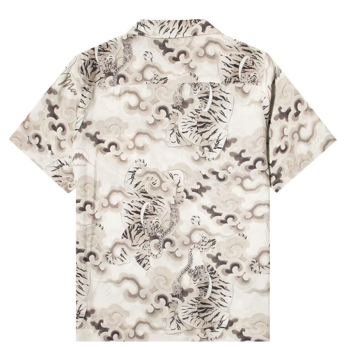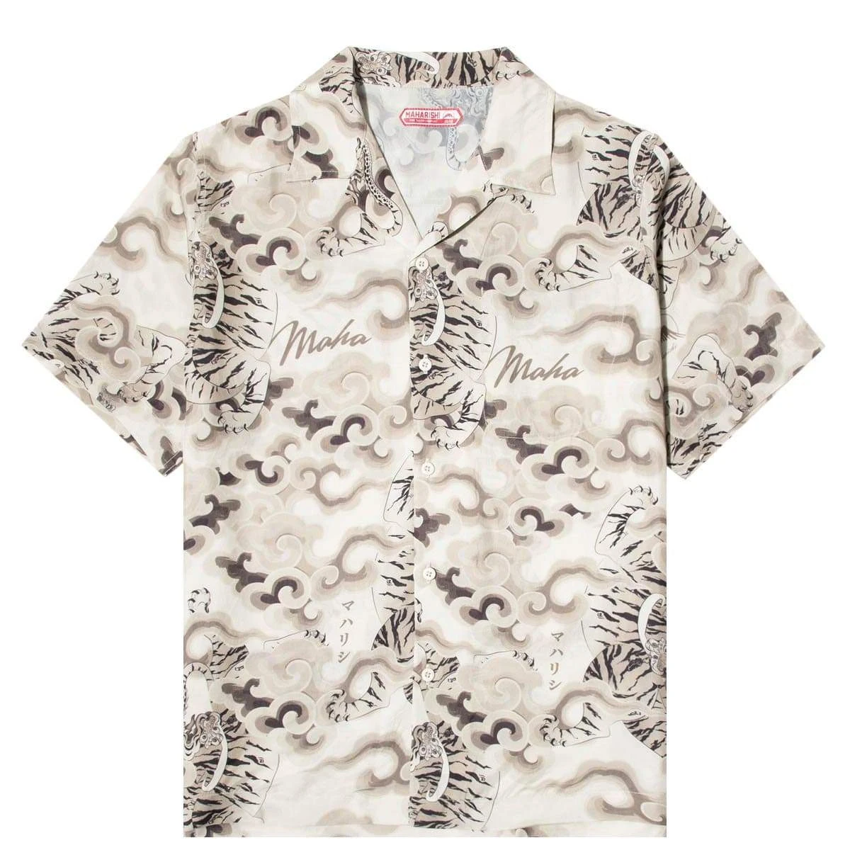 Constructed from a Cupro twill, a silk-like fabric with a soft handle, this camp collar short sleeve shirt features an all-over multicolour Tibetan cloud print by calligraphy master Tashi Mannox and inspired by the Maharishi Fine Tailor Company’s expansion into Tibet and Nepal.