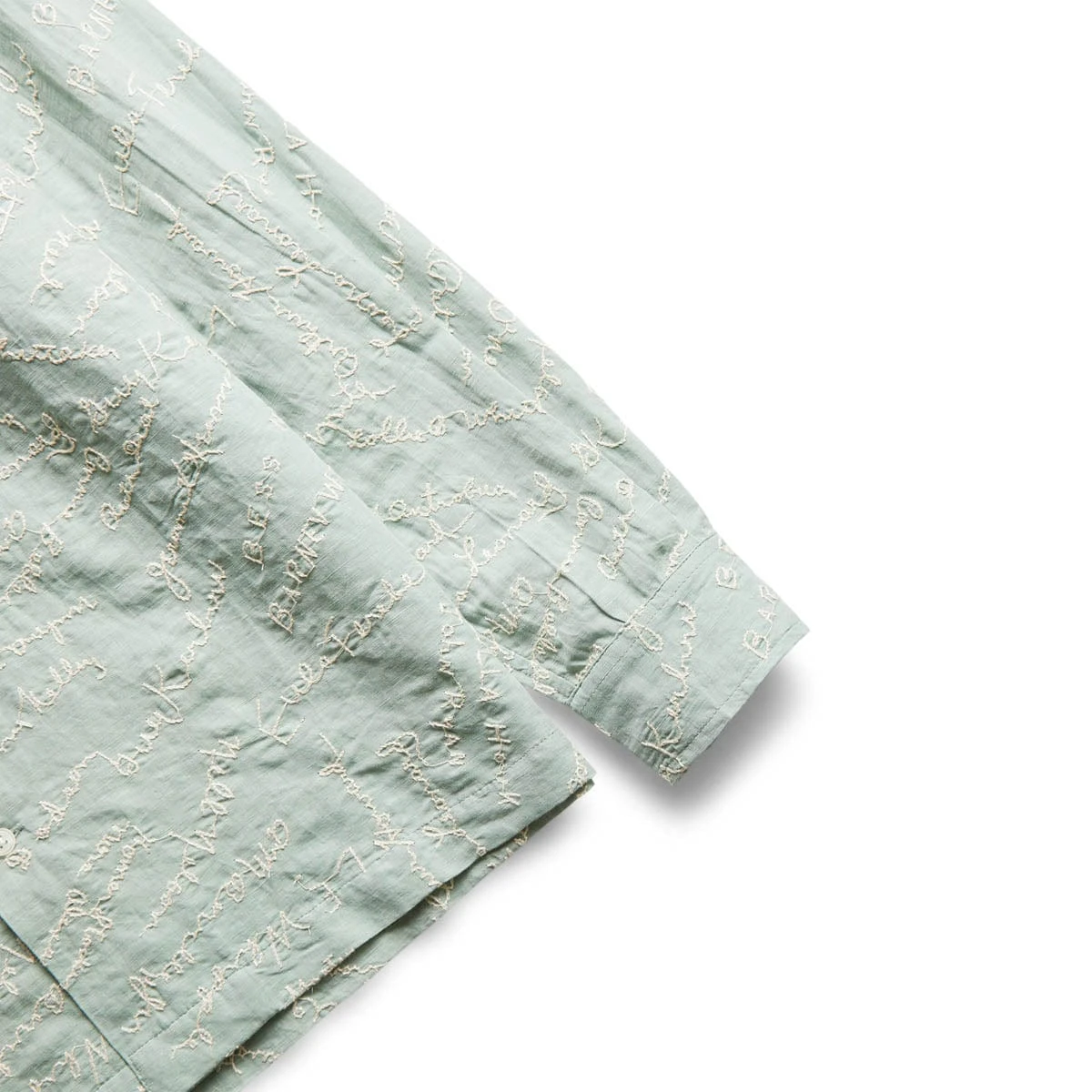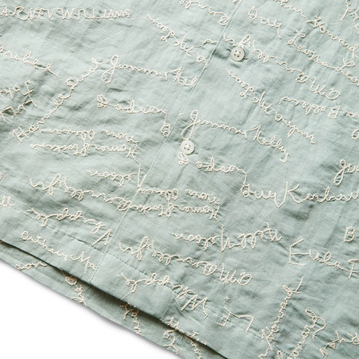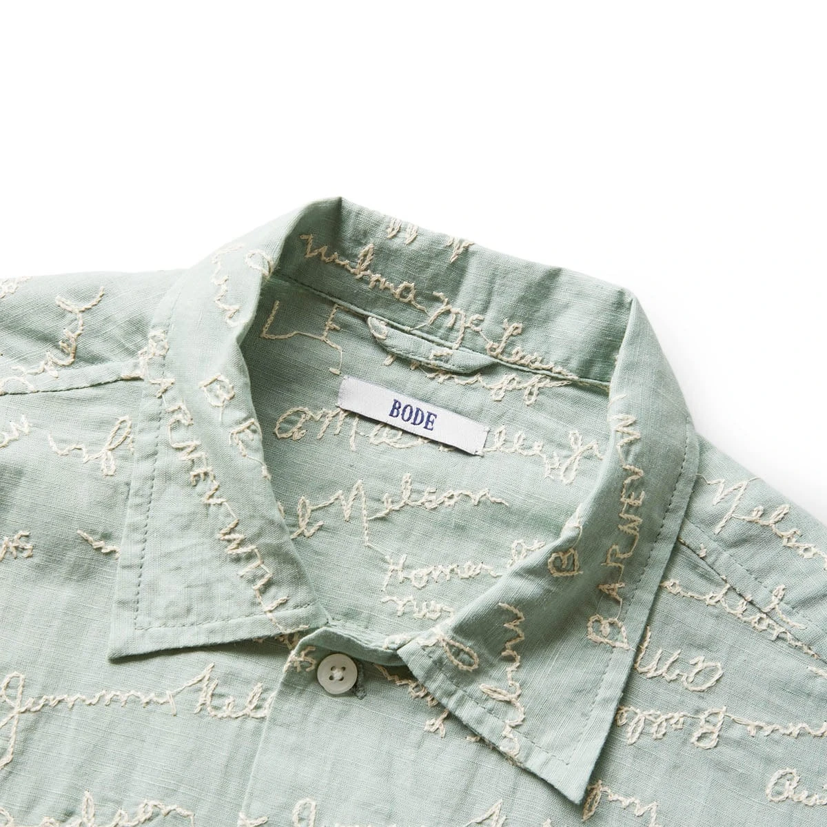 This long sleeve shirt is inspired by a 1950s embroidered panel. The shirt features a faithful reproduction of the all-over embroidery of various names. Groups of friends would often sign fabric which would then be embroidered and used for pillowcases or other mementos.Â