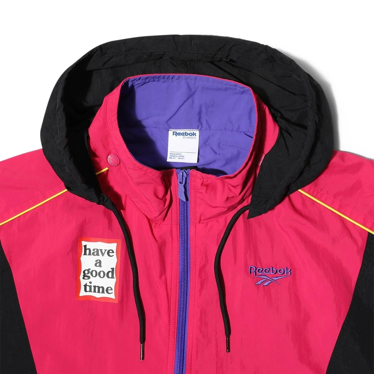 A classic, half-zip anorak silhouette and vivid color blocking, featuring black, purple and a deep neon pink, are 90s sportswear staples, but Have A Good Time put their own, subtle spin on the design, with a stowaway hood and front pocket secured by snap closures, size zips, and a back, zip pocket.